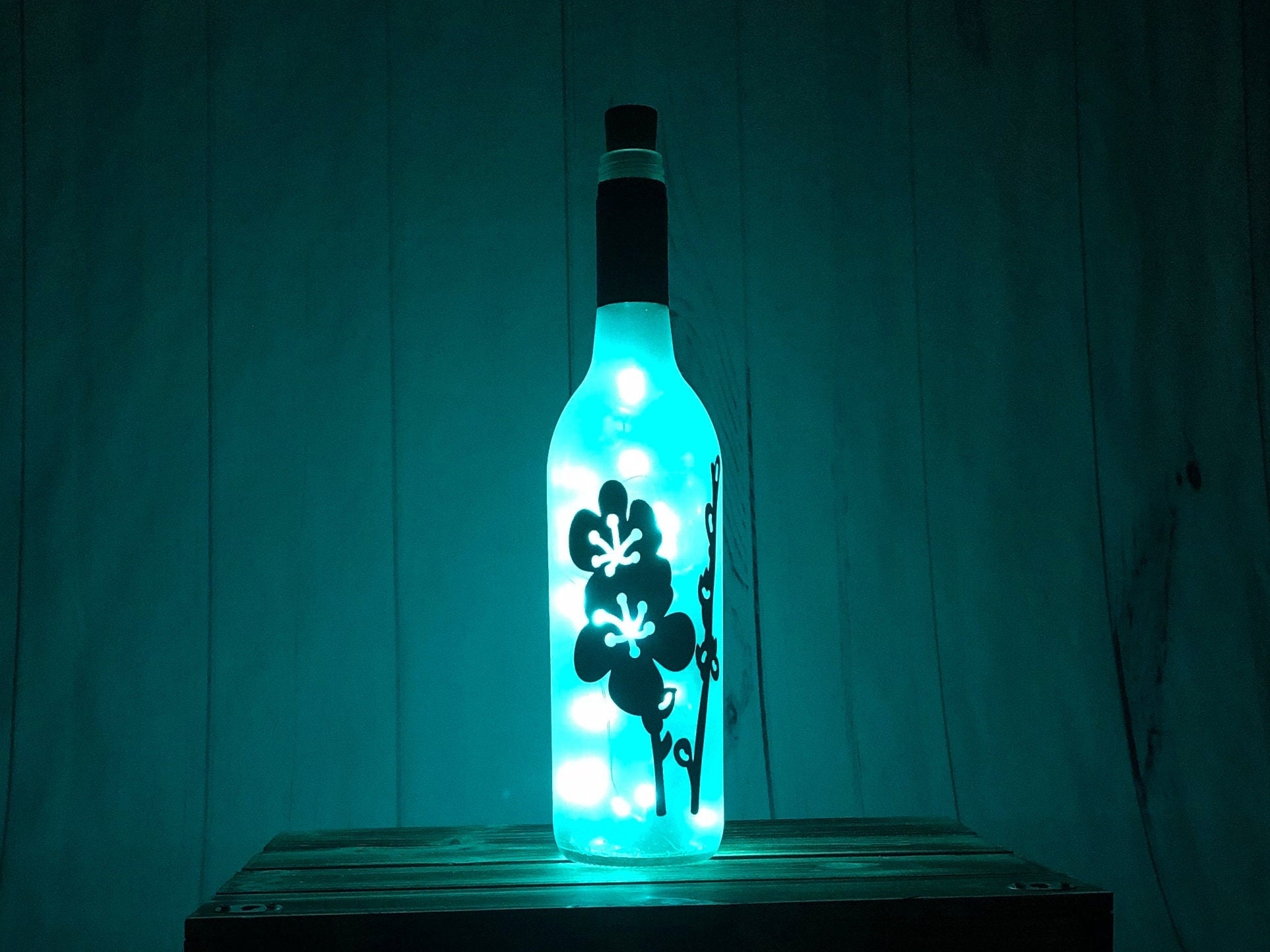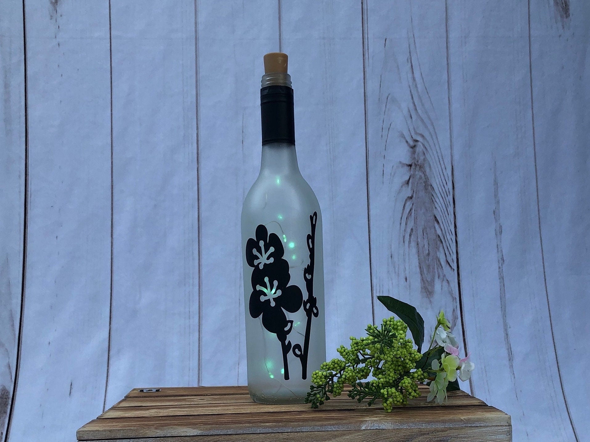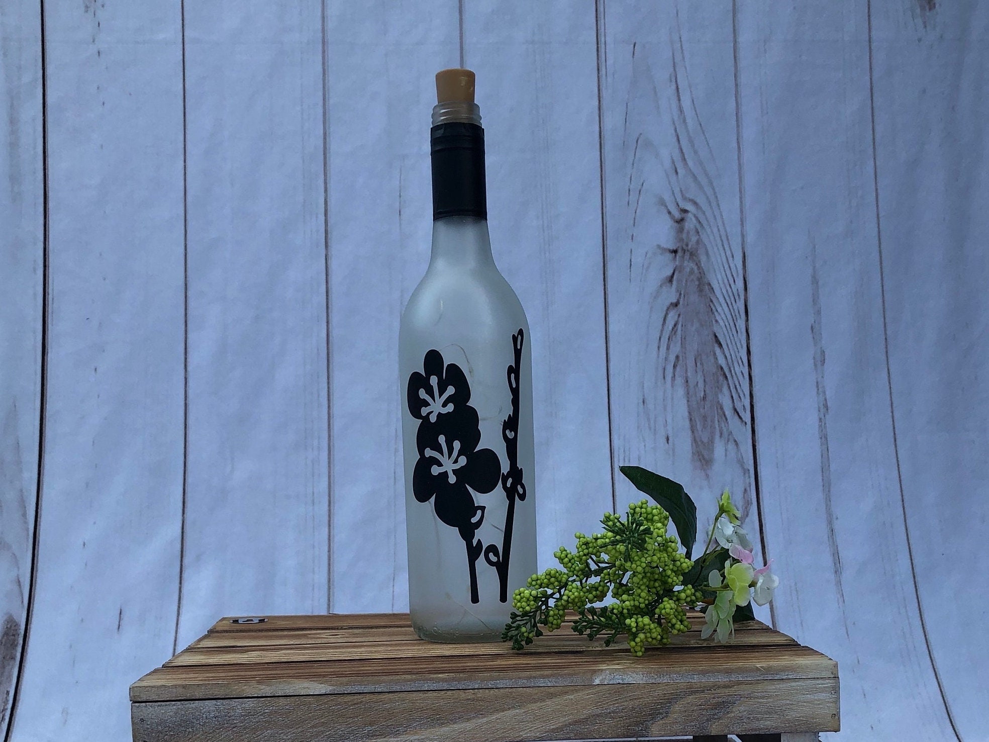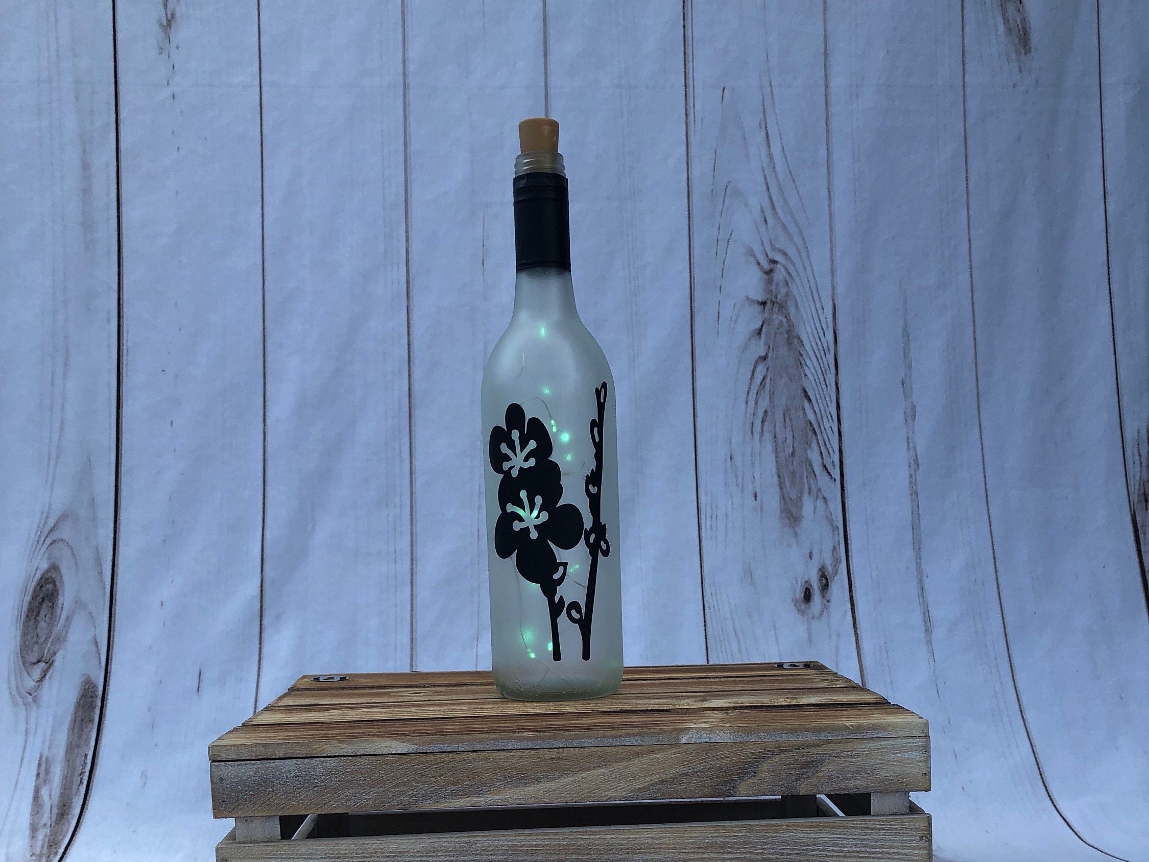 This flower wine bottle light is perfect for your spring and summer decor. The flowers are cut from permanent vinyl, and the bottle is frosted to diffuse the light into a soft glow and make the design stand out.