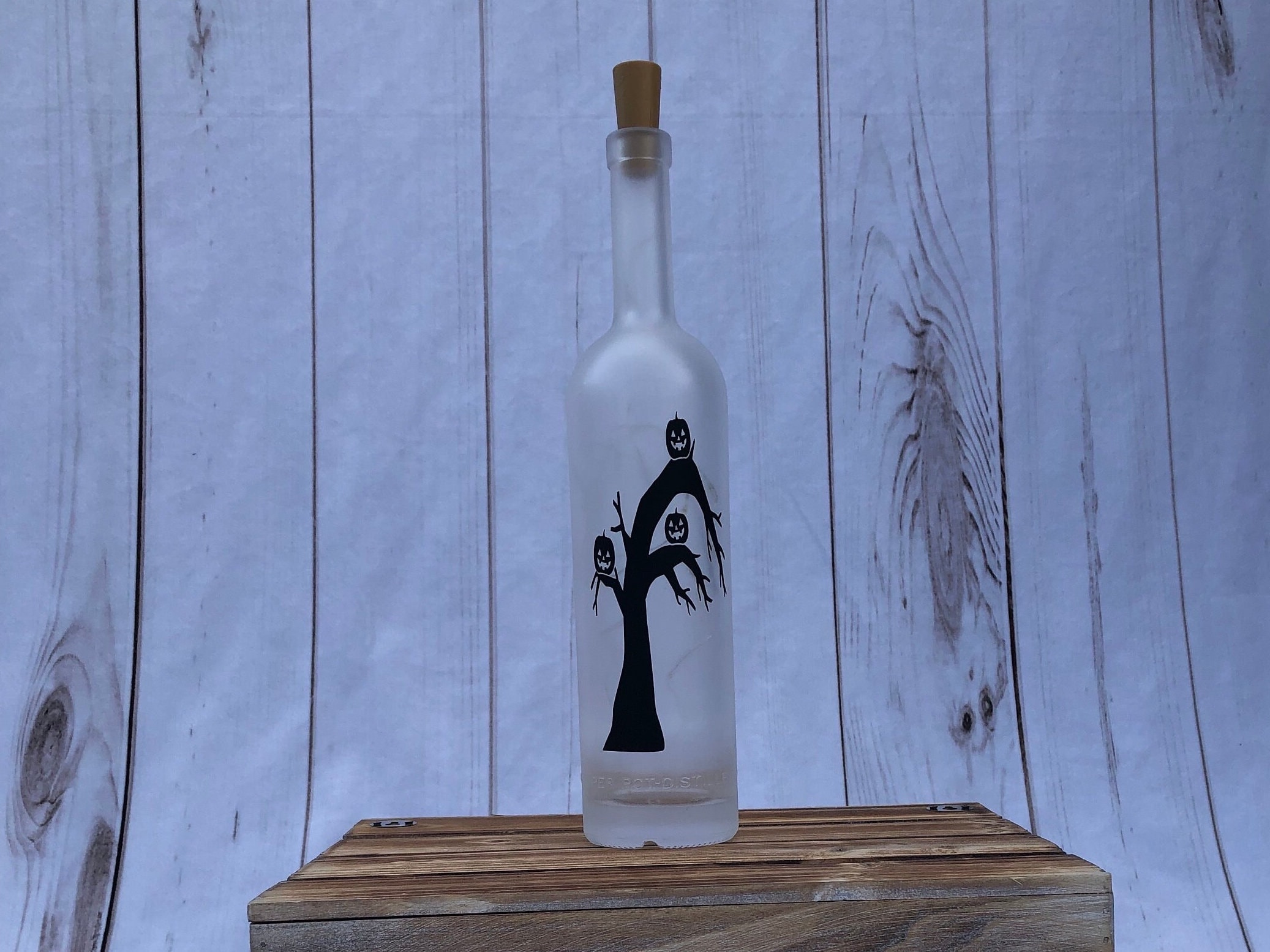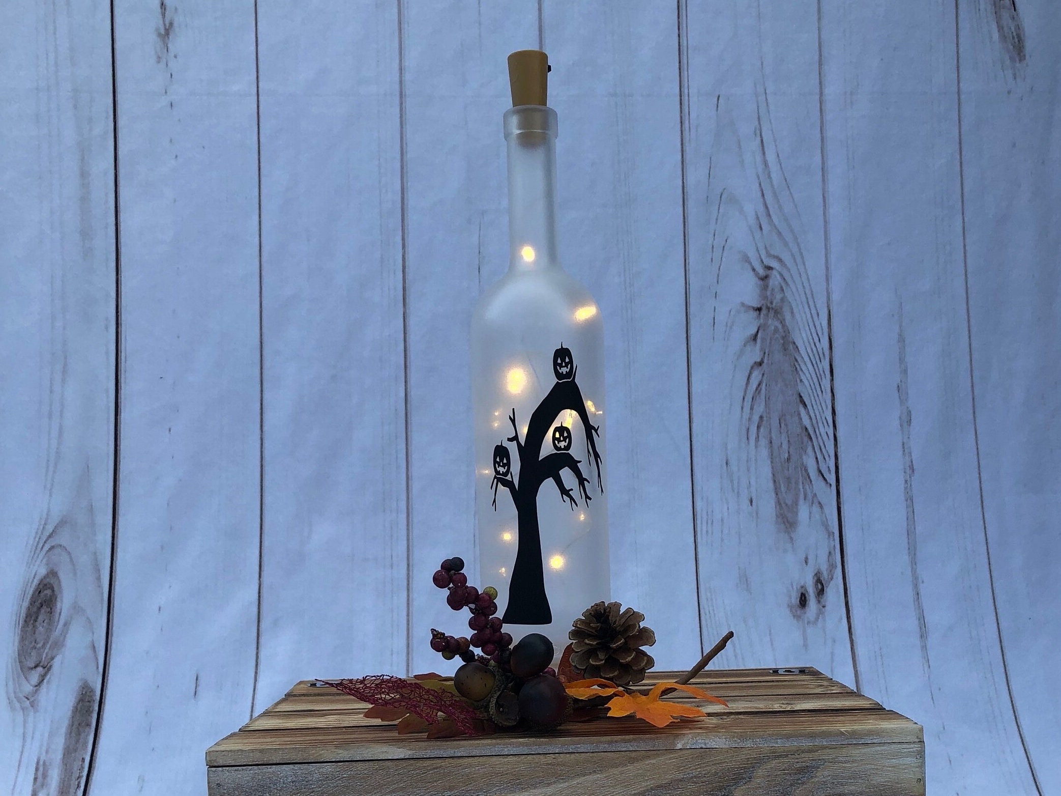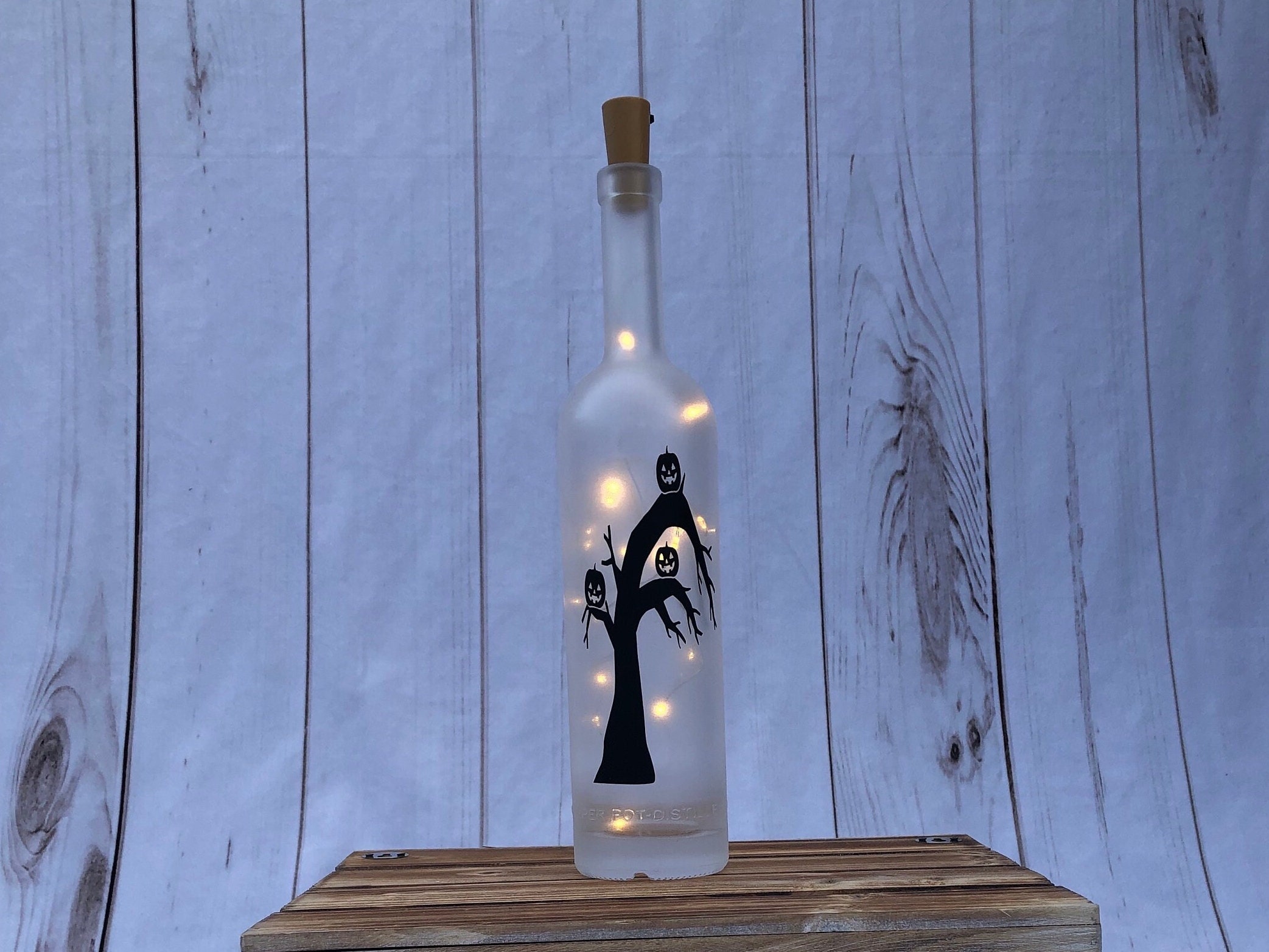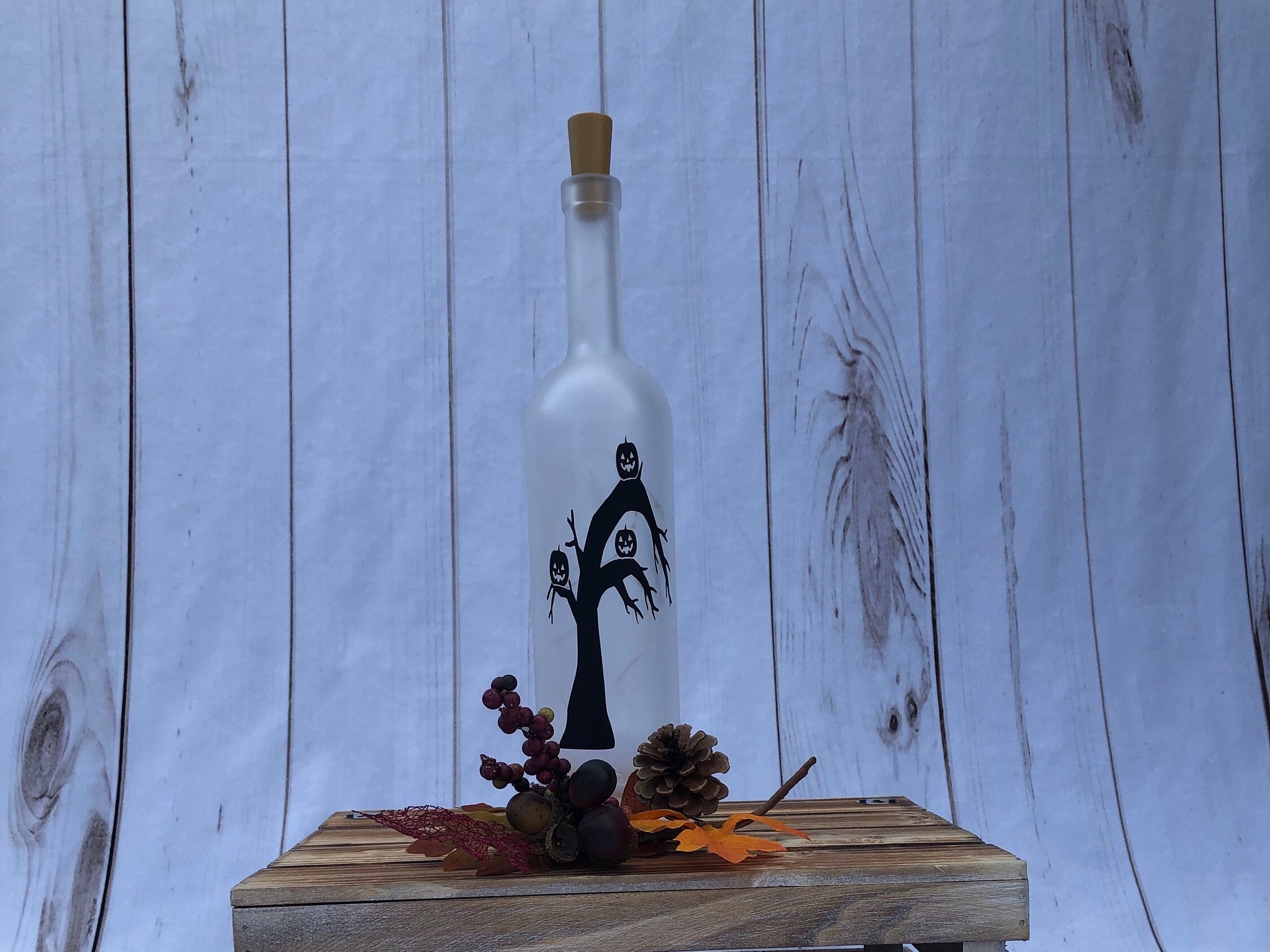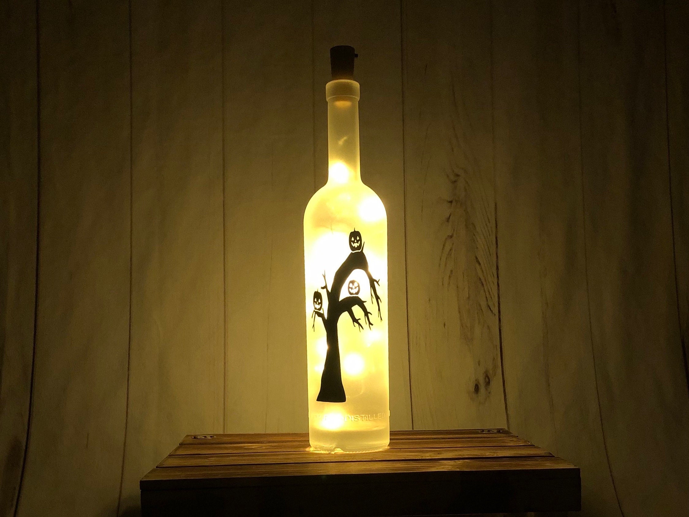 This wine bottle light is perfect for your Halloween decor. Featuring 3 jack o’ lanterns in a spooky tree, the bottle is frosted to diffuse the light into a soft glow and make the design stand out.