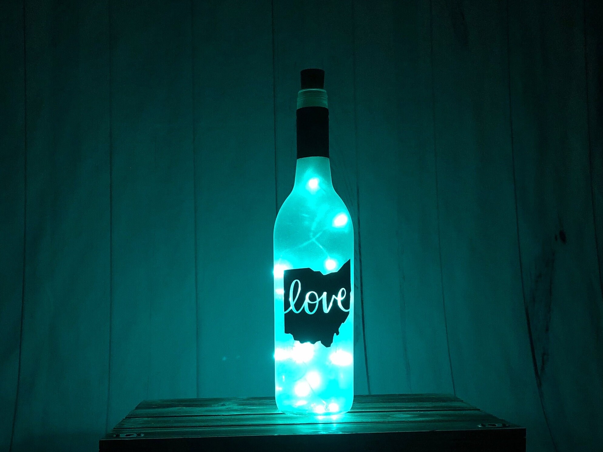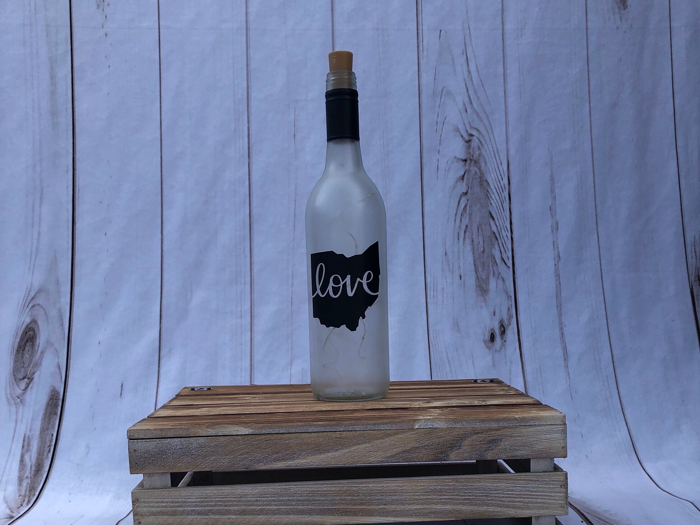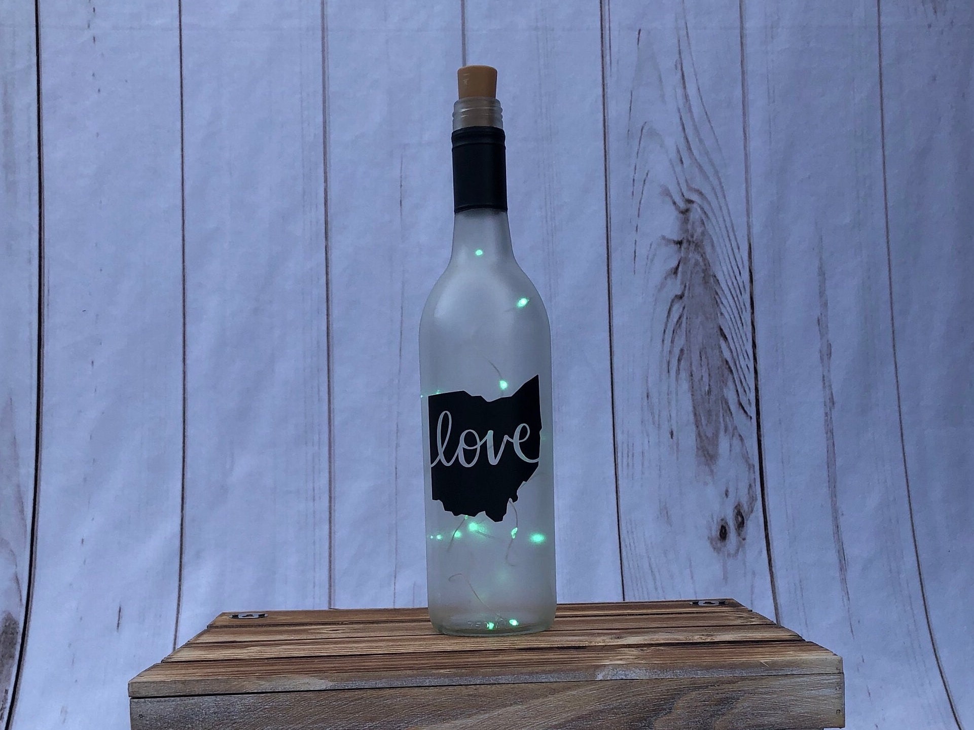 This wine bottle light is perfect for the Ohio lover in your life! The Ohio design is cut from permanent vinyl, and the bottle is frosted to diffuse the light into a soft glow and make the design stand out.