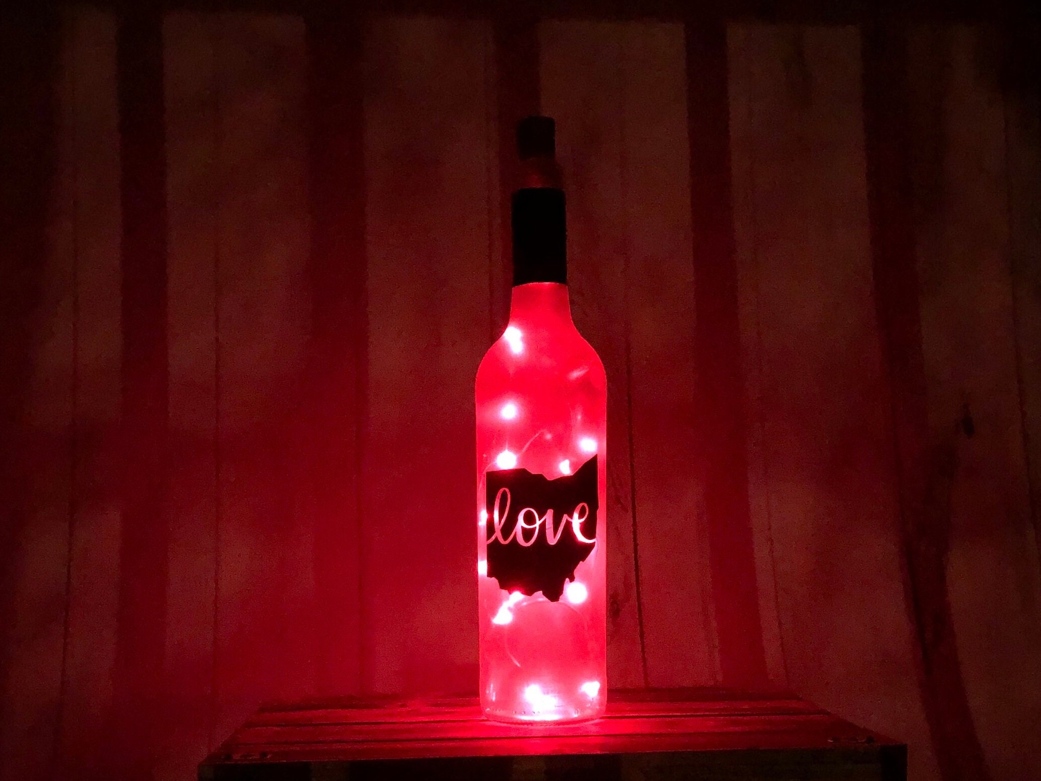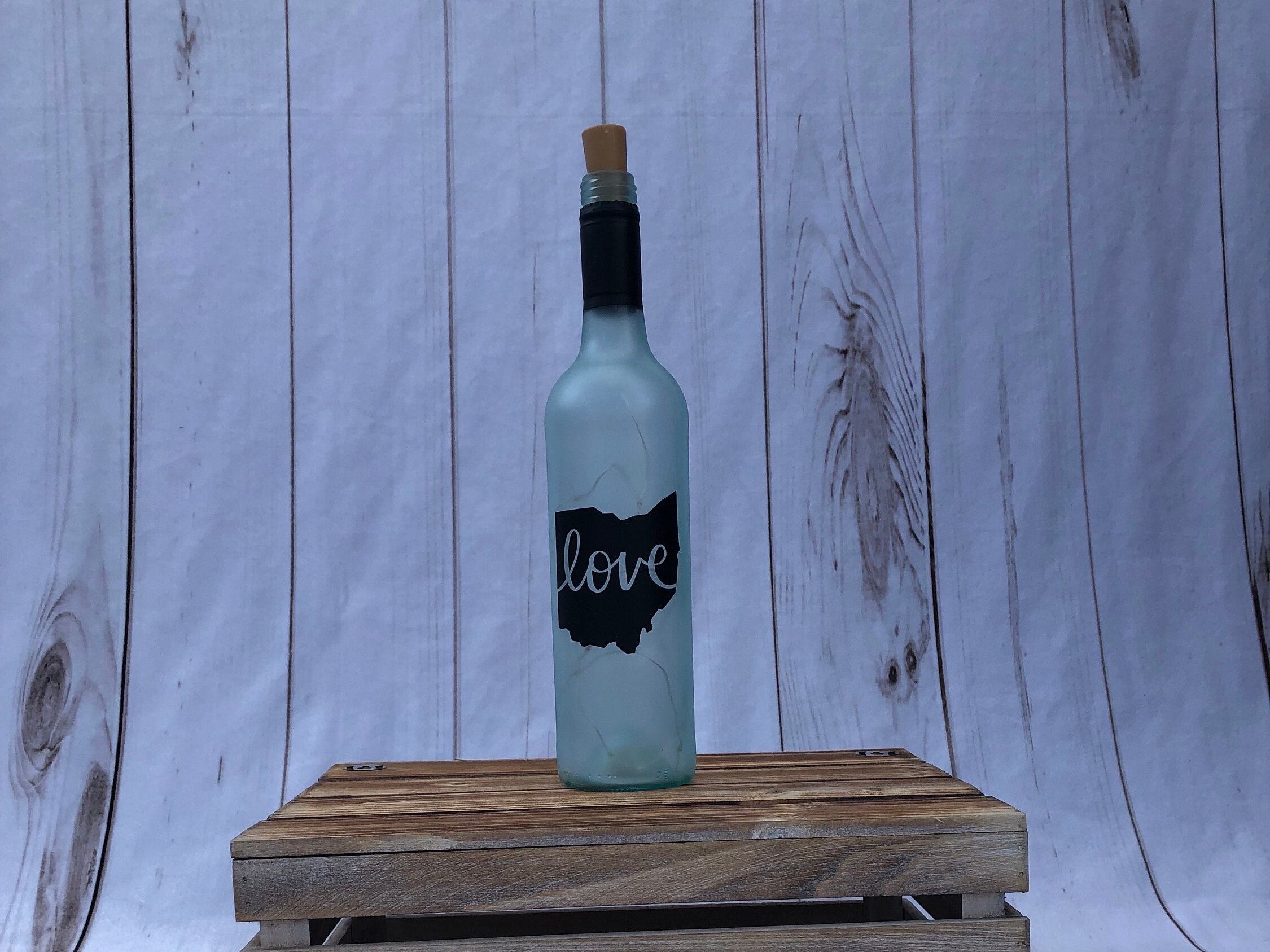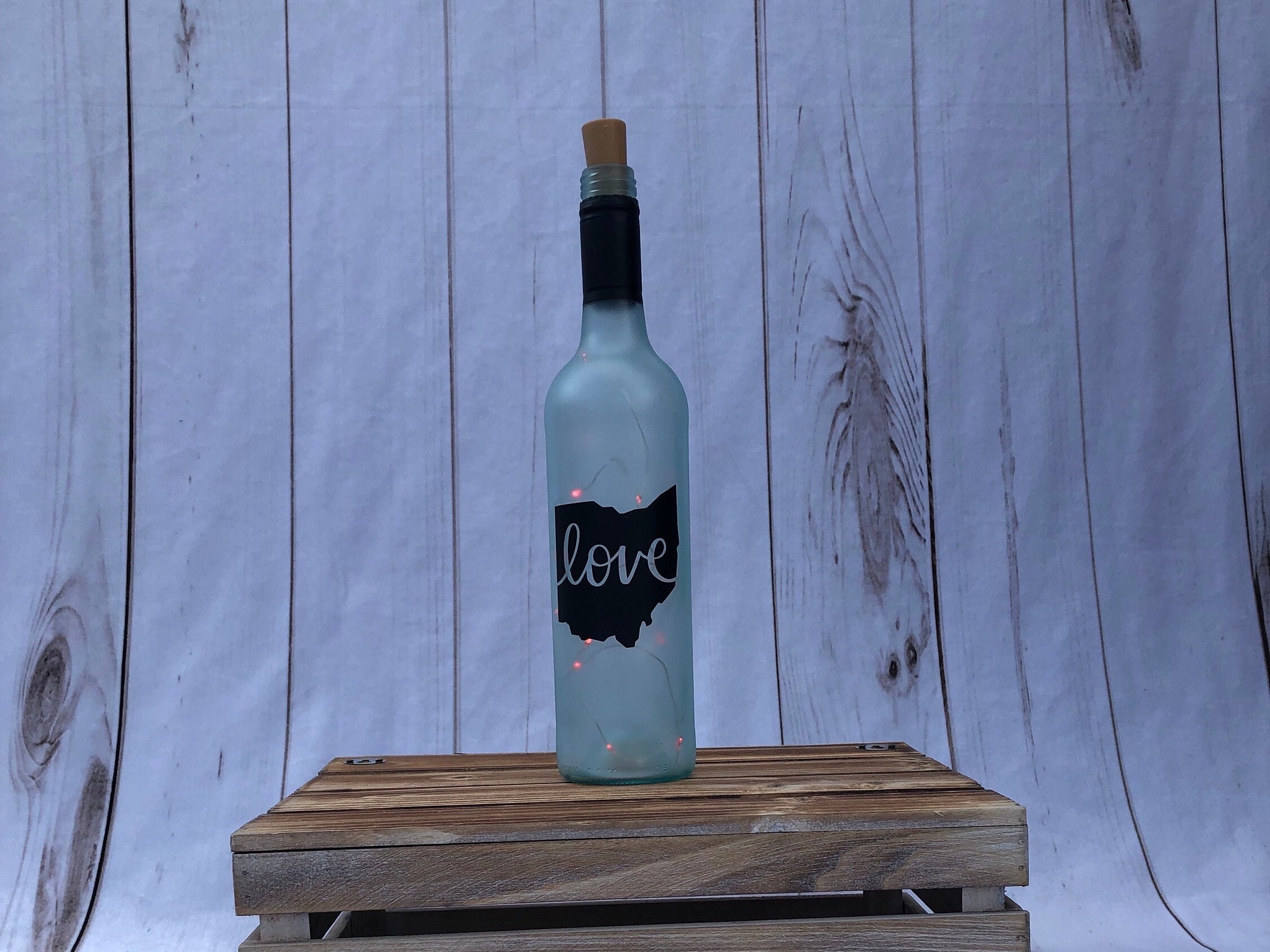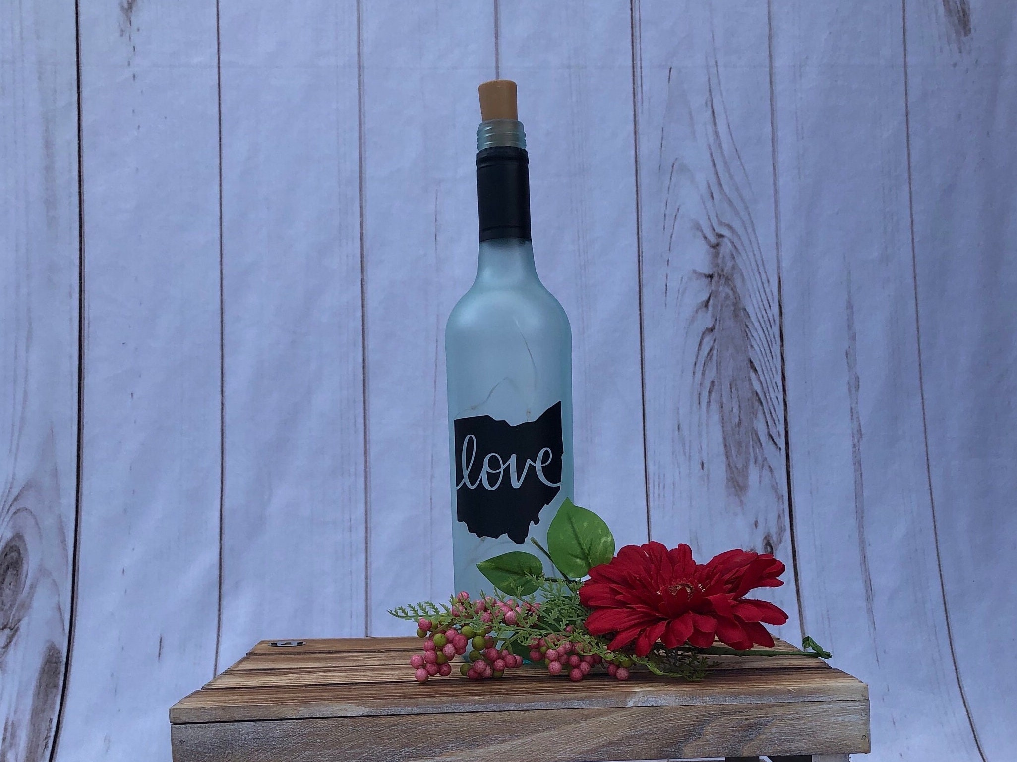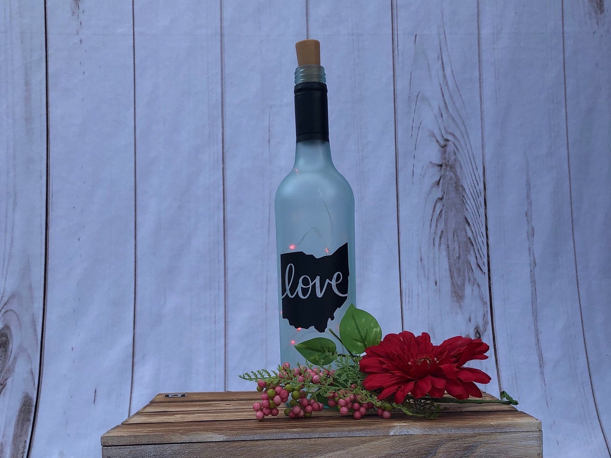 This wine bottle light is perfect for the Ohio lover in your life! The Ohio design is cut from permanent vinyl, and the bottle is frosted to diffuse the light into a soft glow.