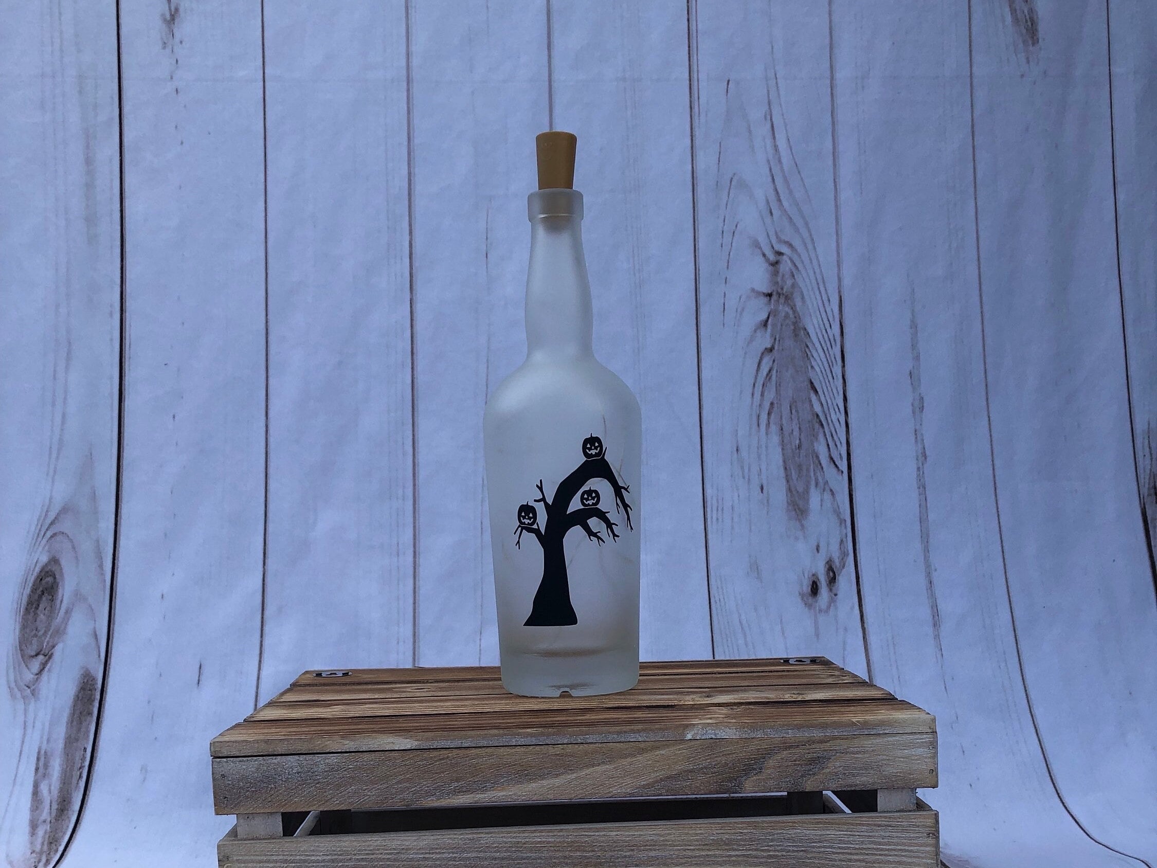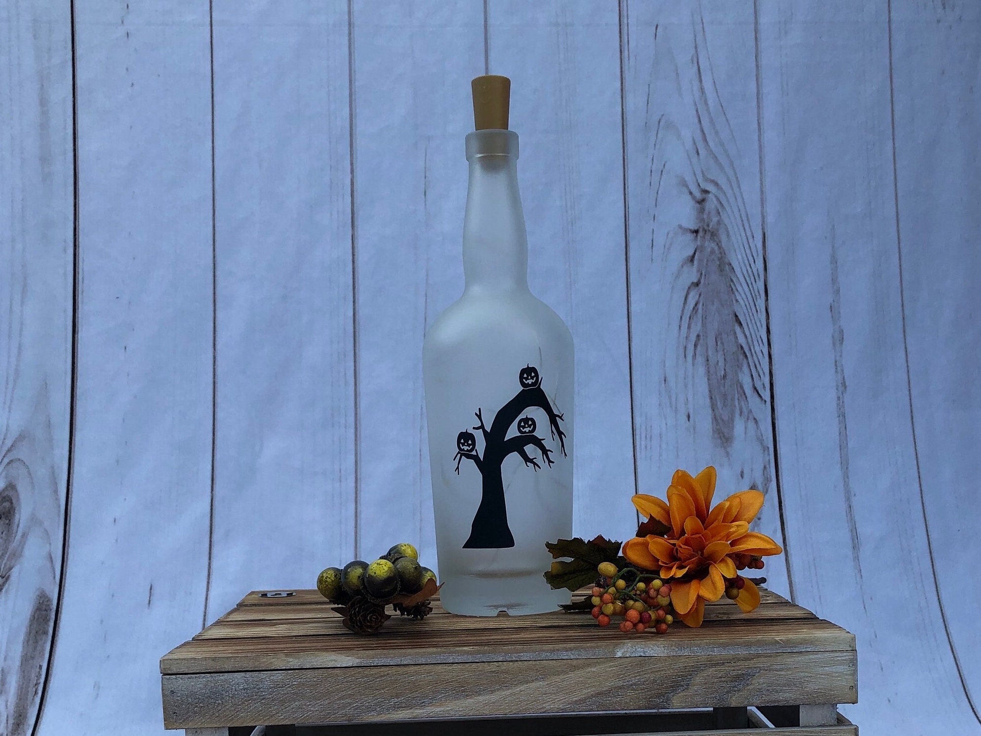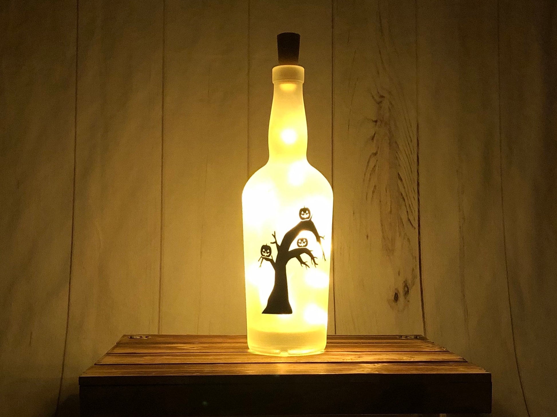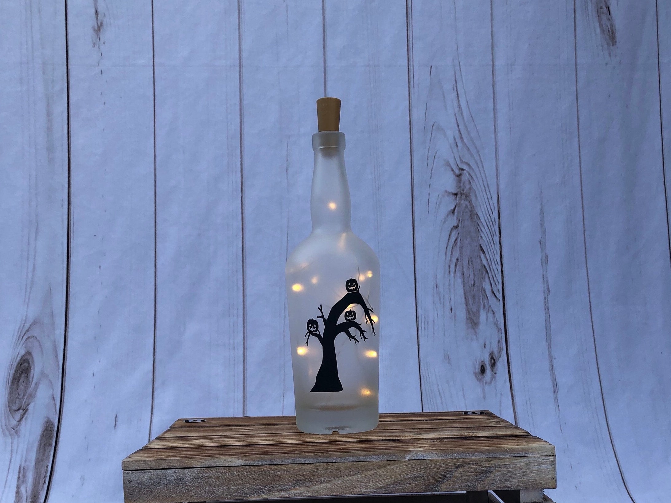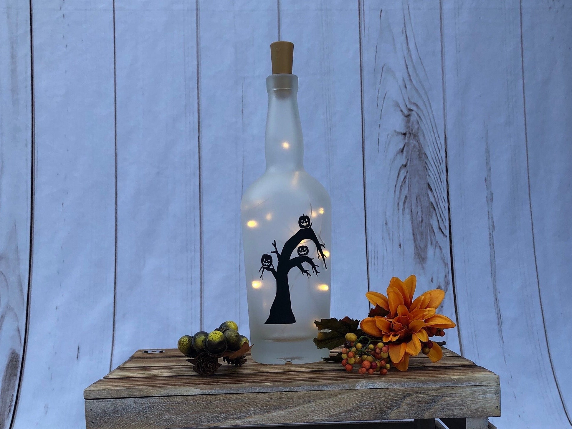 This wine bottle light is perfect for your Halloween decor. Featuring 3 jack o’ lanterns in a spooky tree, the bottle is frosted to diffuse the light into a soft glow and make the design stand out.