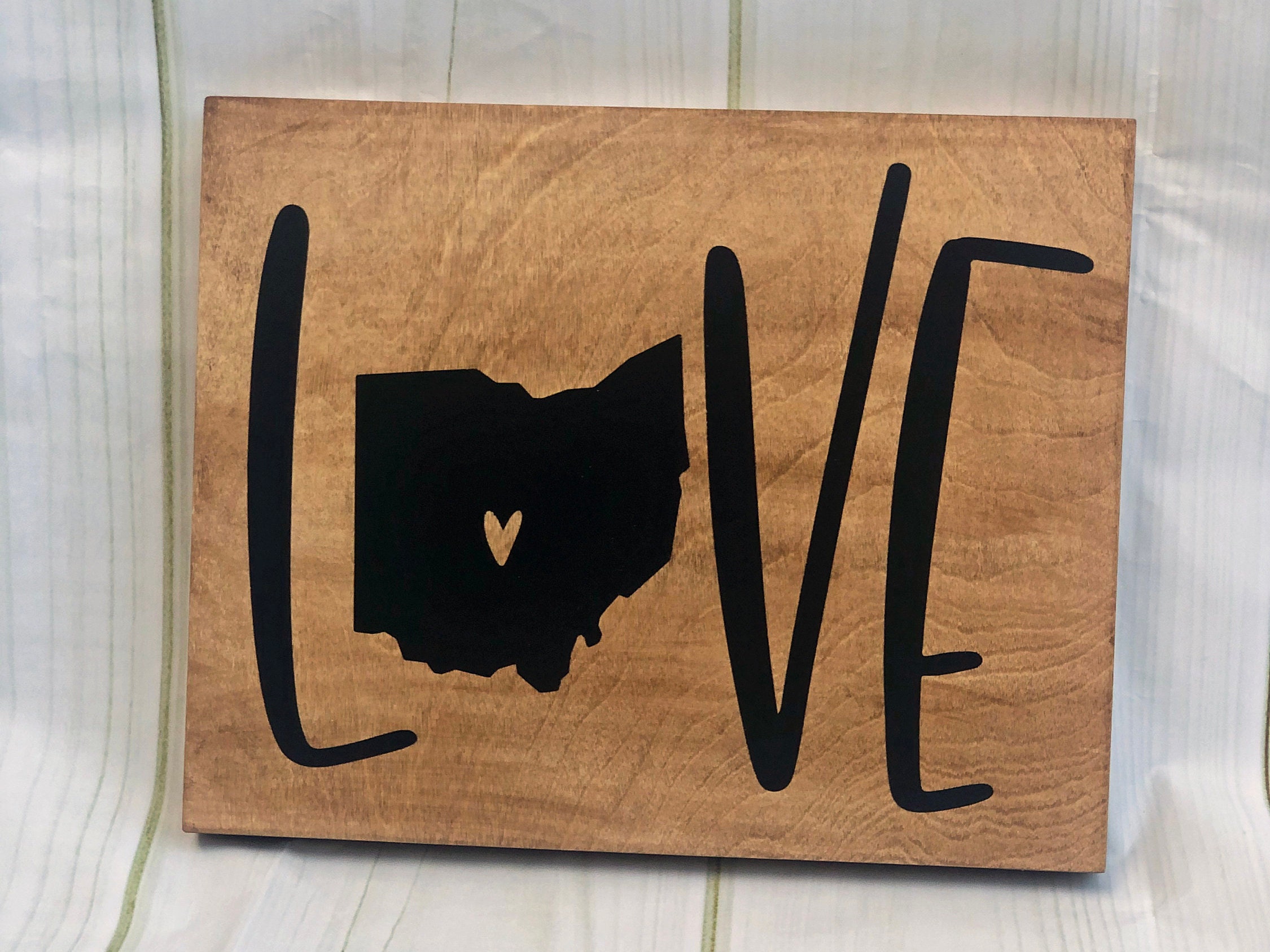 Show your love for the Buckeye state with this painted wood sign. The background is washed in brown, with LOVE painted in black